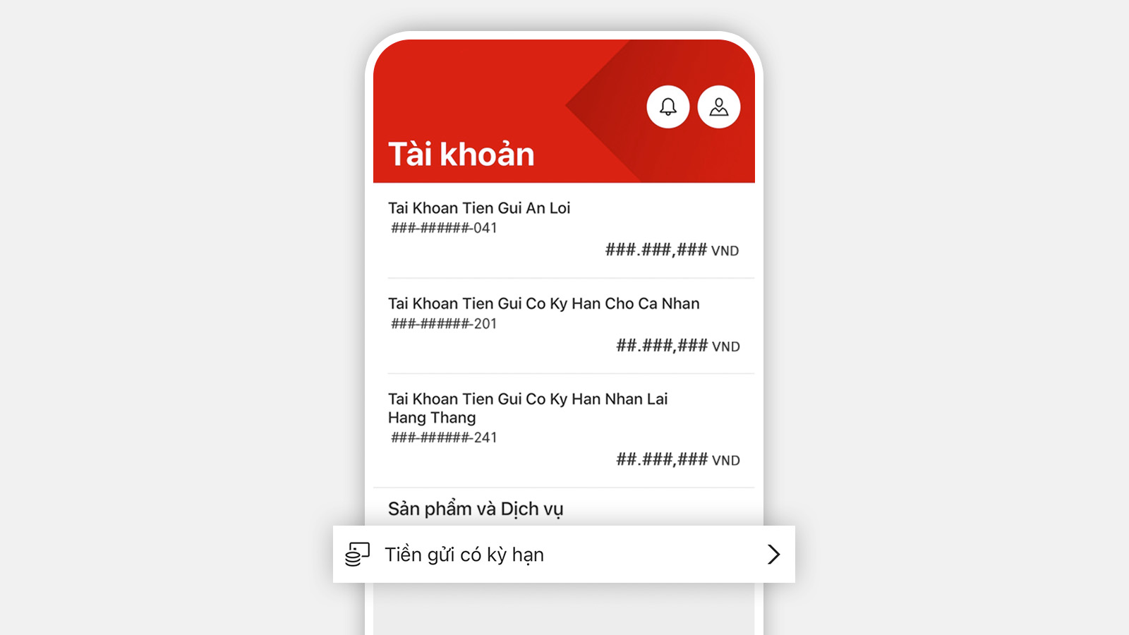 - Đăng nhập Ứng dụng HSBC Việt Nam và chọn “Tiền Gửi Có Kỳ Hạn” trong trang Tài khoản